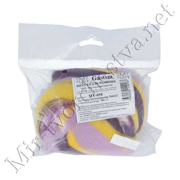 Шерсть для валяния полутонкая (микс), Желтый/Светлая фиалка/Тёмный цикламен (6112), 50г, Gamma