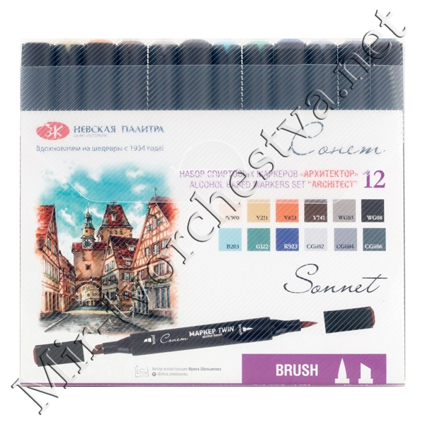 Набор спиртовых маркеров Twin Brush "Архитектор", 12 цветов, Сонет