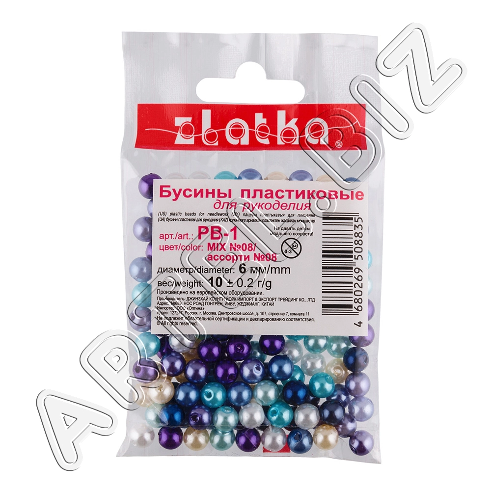 Бусина "Zlatka" MIX пластик PB-1 6 мм 10x10 г №08 ассорти