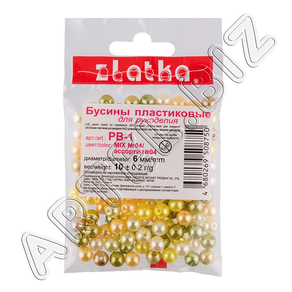Бусина "Zlatka" MIX пластик PB-1 6 мм 10x10 г №04 ассорти