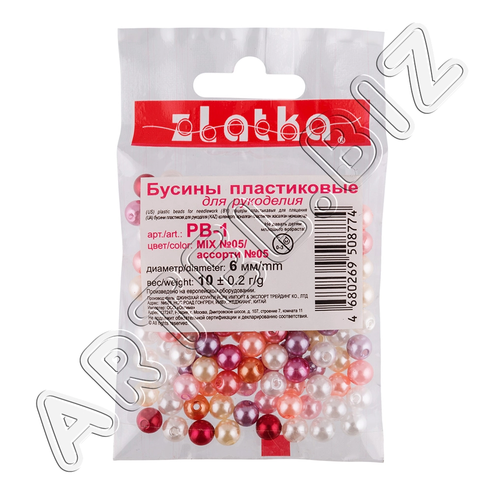 Бусина "Zlatka" MIX пластик PB-1 6 мм 10x10 г №05 ассорти